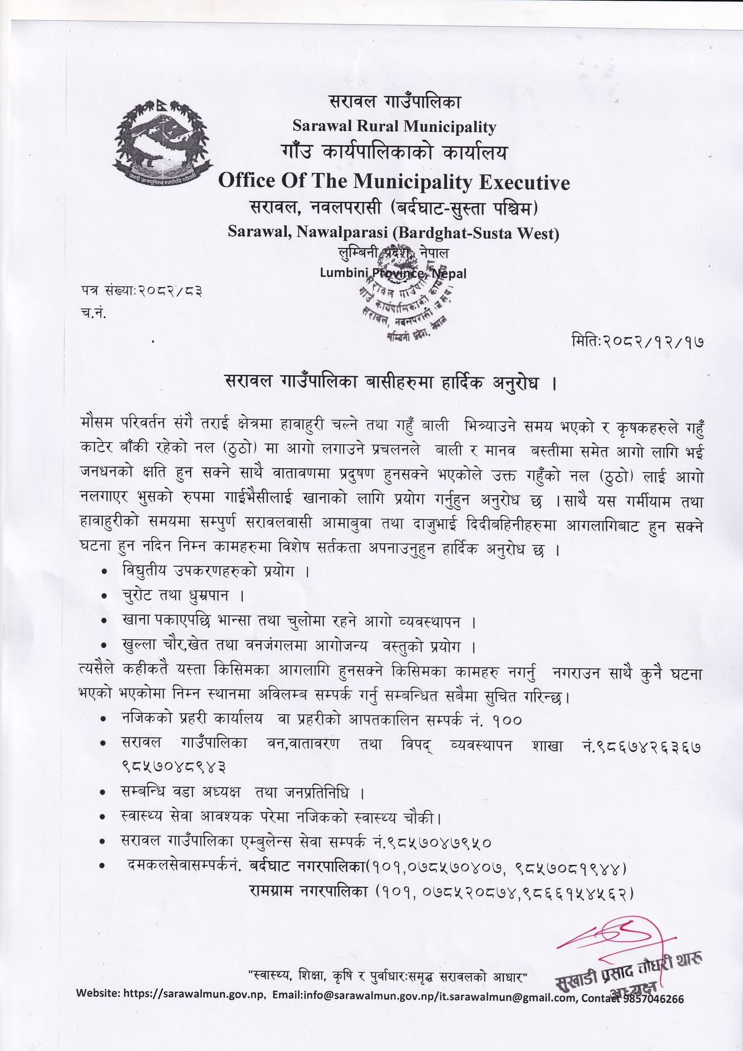 सरावल गाउँपालिकाको कार्यालयले आज जारी गरेको सूचनामा मौसम परिवर्तनसँगै तराई क्षेत्रमा हावाहुरी चल्ने तथा गहुँबाली भित्र्याउने समय भएकाले खेतबारीमा बाँकी रहेका नल (ठुटो) मा आगो लगाउने प्रवृत्तिले आगलागीका घटना बढ्न सक्ने उल्लेख गरिएको छ ।